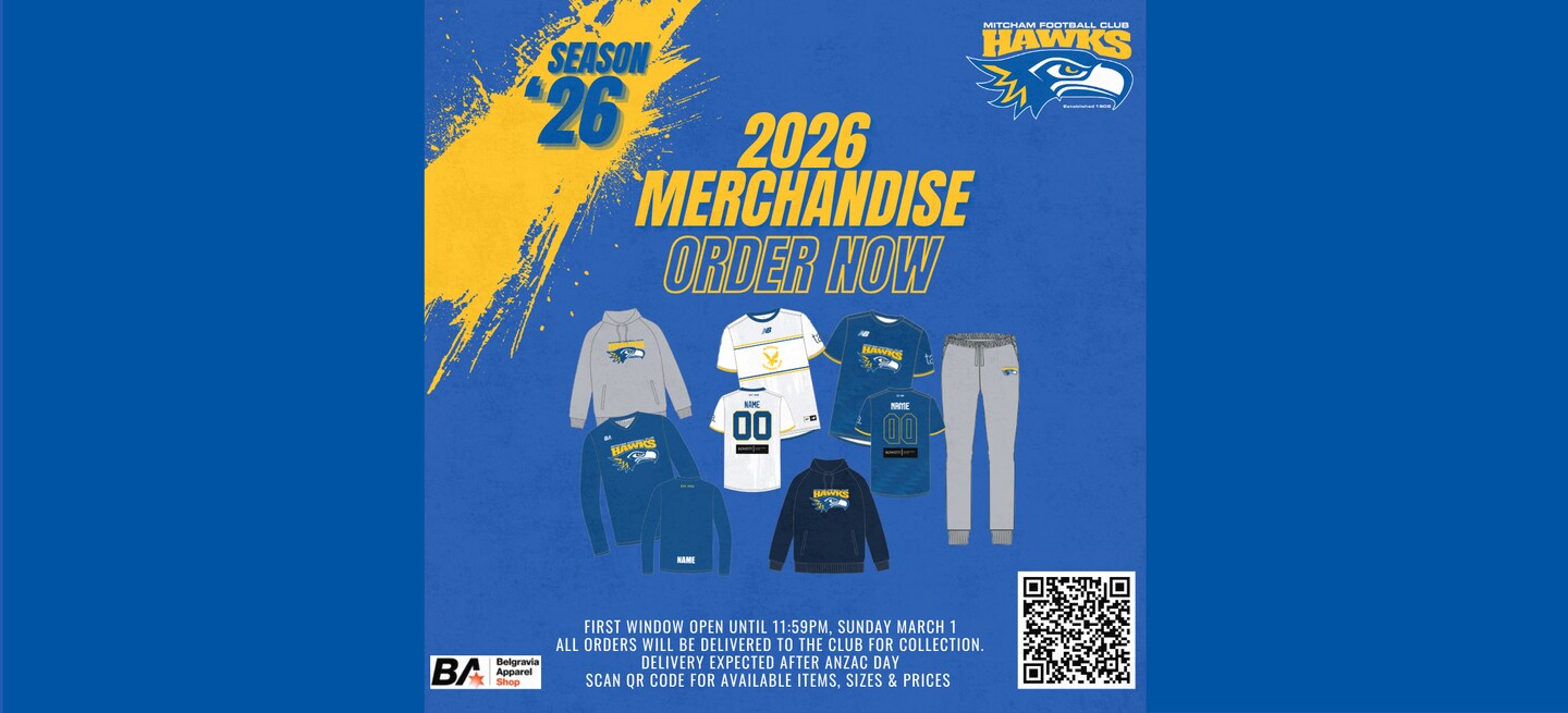 This is the first opportunity to purchase Mitcham Hawks apparel for 2026. All orders must be placed by 11:59pm, Sunday March 1 to be received in the first delivery consignment, scheduled for just after ANZAC Day.